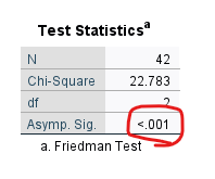 Test Statistics tablosundaki Asymp. Sig. değeri, Friedman Testi’nin p değerini göstermektedir. Bu değer 0.05’in altında ise istatistiksel anlamlılık vardır demek oluyor. Yani en az 1 grup arasında istatistiksel olarak anlamlı bir farklılık var demek oluyor.
