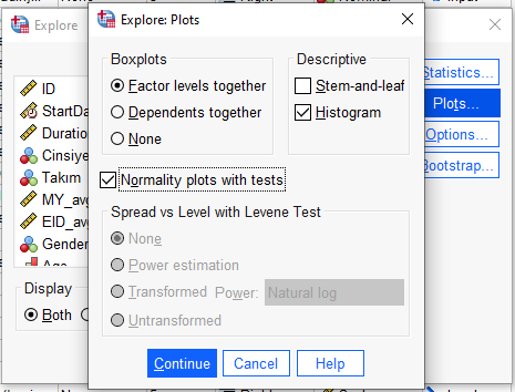 Plots butonuna basıyoruz. Açılan pencerede aşağıdaki gibi, “Normality plots with tests” ve “Histogram” seçeneklerini işaretliyoruz. Continue’ya basıyoruz.
